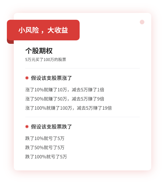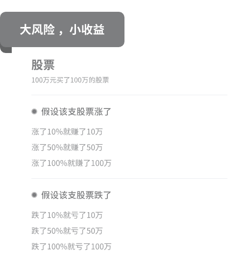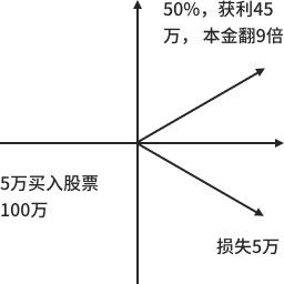 本金5万(价值100万股票),涨50%,盈利50万 本金5万(价值100万股票),跌50%,亏损5万 本金5万(价值100万股票),跌50%,亏损5万 |